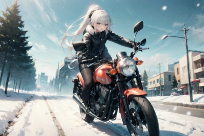 masterpiece, best quality, extremely detailed, anime, girl, rider suit red women, a pretty woman, ponytail, long sleeve, blonde hair, green eyes, goddess, black and green motorcycle, winter, snow, blue sky, sea side, sunny day, cool, ride a motorcycle, driving a motorcycle, <lora:sanDka2:1> <lora:sensualface_type2:1> ,