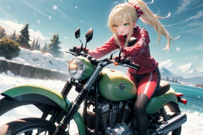 masterpiece, best quality, extremely detailed, anime, girl, rider suit women, a pretty woman, ponytail, long sleeve, silver hair, green eyes, big sister, motorcycle, black and red motorcycle, winter, snow, blue sky, countryside, sunny day, cool, ride a motorcycle, driving a motorcycle, red rider suit , <lora:sanDka2:1> <lora:sensualface_type1:1> ,