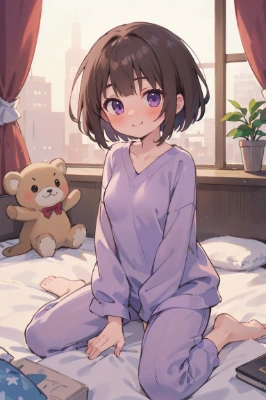 masterpiece, best quality, extremely detailed, anime, girl, <lora:hairdetailer:0> <lora:hohoaka:1> , New Year\@!@s Eve, bobcut, brown hair, purple eyes, lying down, ((medium breasts)), (Plush Loungewear Set), (small cute girl), smile, bedroom, (Holding pillow:1.3),