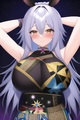 masterpiece, best quality, extremely detailed, anime, <lora:flat2:-0.45> <lora:hairdetailer:0.45> Girl [arms up] Loose[sidelocks eddy-hair between eyes medium eddy hair] in[many-Color][eddy-pattern-print]-[fantasy[leather-eddy-dress] makeup , [Tenpura around baked-beef around on rice][eddy-Accessories around][fantasy eddy-fluttering[[kaleidoscope]] mist. Eddy pattern around spot light] , perfect sophisticated attractive ornament in complicated detail-decoration detail ultimate fascination best impressive infinity vivid absurdly clearly excellent ultimate intricate-pattern cute beautiful light ultimate rare perfect wonderful cool perfect delicate maximum quality art illustration picture,