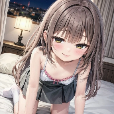 a girl, long dark gray hair, leaning forward, very very short light gray skirt, white bra, white panties, stripped big bust, stripped big hip, black socks, holding a cat, look up, look at me, smile, seen from above, right in front, night, bedroom, bed,kawaiitech, pastel colors, kawaii, cute colors, best quality, extremely detailed, anime <lora:make25d_type1_v100:1> <lora:sensualface_type1:1> ,,