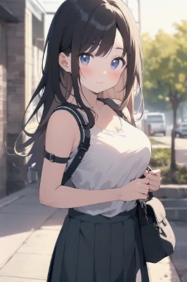 masterpiece, best quality, extremely detailed, beautiful detailed glow, ultra high res, beautiful, best aesthetic, 8k, anime, 1 girl , (junior high school), ((medium breasts)),(shoulder bag strap between breasts paisura) <lora:flat2:0.4> <lora:hairdetailer:0> ,,,