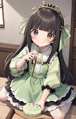 (((very longest hair))),black hair, smile, straight Hair,hair ribbon,mintgreen stripe,Black Eyes,flat chest,straight Across bangs,princess Cut, Very Long Sideburn,roundry Head,Droping eyes,cute,Meekness,Bob Cut,long back hair,12 years Old,loli,god,lighting,halo,nimbus,