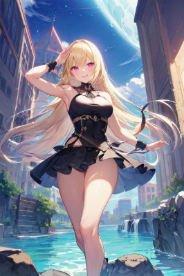 , masterpiece, best quality, extremely detailed, beautiful detailed glow, ultra high res, beautiful, best aesthetic, 8k, anime , a pretty woman, longhair, blonde hair, pink eyes, ((medium breasts)), happy smile, thighs, (green)tube top <lora:flat2:0> <lora:hairdetailer:0.7> ,,