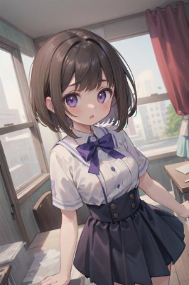 masterpiece, best quality, extremely detailed, beautiful detailed glow, ultra high res, beautiful, best aesthetic, 8k, anime, 1 girl , bobcut, brown hair, purple eyes, (junior high school), ((medium breasts)), , (god:1.3) <lora:flat2:0> <lora:hairdetailer:0.75> ,