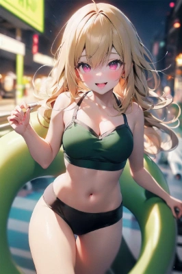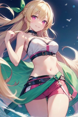 , masterpiece, best quality, extremely detailed, beautiful detailed glow, ultra high res, beautiful, best aesthetic, 8k, anime , a pretty woman, longhair, blonde hair, pink eyes, ((medium breasts)), happy smile, thighs, (green)tube top ,, <lora:hairdetailer:-0.15> <lora:sanDka1:1> ,