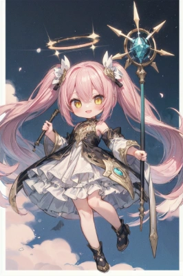 (masterpiece), (best quality),(ultra-detailed),(illustration),(extremely detailed),(perfect anatomy),(super detailed skin),(detailed),(beautiful detailed eyes),1girl,solo, chibi, , pounding mochi, twintail, pink hair, blue eyes,japanese clothes, kimono, (holding hammer), (hammer), holding weapon, hands up, incoming attack,smile, <lora:flat2:0.35> <lora:hairdetailer:1> ,