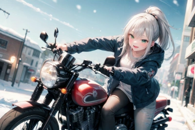 masterpiece, best quality, extremely detailed, anime, girl, rider suit women, down jacket, a pretty woman, ponytail, long sleeve, silver hair, green eyes, big sister, smiling, a silver and red motorcycle, motor vehicle, motorcycle, ground vehicle, vehicle focus, winter, rain, downtown, cool, rider rain suit , ride a motorcycle, driving a motorcycle , <lora:sanDka2:1> <lora:sensualface_type2:1> ,