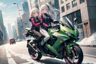 masterpiece, best quality, extremely detailed, anime, girl, rider suit women, down jacket, a pretty woman, ponytail, long sleeve, silver hair, green eyes, big sister, a black and red motorcycle, motor vehicle, motorcycle, ground vehicle, vehicle focus, winter, snow, downtown street, cool, rider suit , ride a motorcycle, driving a motorcycle , <lora:sanDka2:1> <lora:sensualface_type1:1> ,
