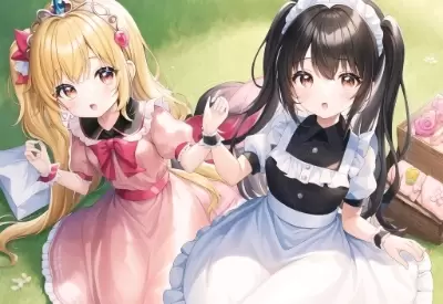 masterpiece, best quality, cute face, huge smile, petite, {princess(Princess wear pink dress, not maids' uniform) and maid(Maid has black hair and wears a black and white maid's uniform)}, {{Blonde princess}}, dark-hair maid, {{{Blonde with pink dress}}}, dark-hair with maid uniform, loli, little girl, little, child, 10 years old, medium breasts, {{{2girls}}}, {{{yuri}}}