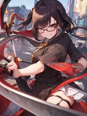 ((masterpiece:1.4, best quality)), ((masterpiece, best quality)),1woman,black chinese clothes,happy smile,standing,large breasts,{{{curvy}}},(((mature female))),long hair,absurdres,(((shibuya city))),(((She has a shinigami scythe))),{{{{death scythe}}}},