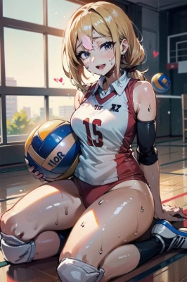 (((masterpiece))), (((best quality))), (((ultra detailed))), (((high-resolution))), ((super fine illustration)), ((Ultimate cutie)), detailed beautiful face, shiny hair, short ponytail, (((gyaru))), (medium breasts), (((solo))), ((seductive smile)), ((embarrassed expression)), ((blush)), (half open mouth), BREAK, ((sit astride the Perfectly spherical 6" volleyball)), ((straddling on the Perfectly spherical 6" volleyball)), ((((Perfectly spherical 6" volleyball fits perfectly crotch)), (((Rub the Perfectly spherical 6" volleyball against crotch)))), BREAK, (Collared Volleyball Uniform), sleeveless volleyball uniform, ((buruma)), (knee pad), (elbow pad), ((sweat)), ((covered in sweat)), (breath), in Volleyball Court, in gymnasium, lighting, looking at viewer, full body,(spoken heart), <lora:hairdetailer:0> <lora:sensualface_type2:1> ,,,,,