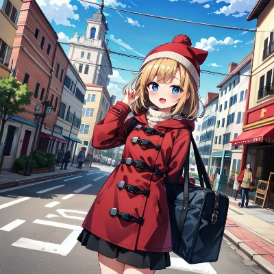 (8Kで, ベストクォリティ, マステピース:1.2)、超高解像度,とてもかわいくて美しい女の子1 人、ultra-detailed face,detailed eyes,(iridescent light:1.4)、黒髪、長いストレートの髪、blunt bangs,詳細な手指,expressionless,open mouse,(porcelain skin:1.2),BREAK,long sleeve dress,red duffel coat,赤のニット帽,魚眼レンズで撮った写真,視聴者を魅了する,amusement arcade