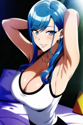 masterpiece, best quality, solo,{{gyaru}},{kogal},eyes,eyeliner,blue eyes,blue hair,short hair,squatting,collared shirt,cleavage,mature female,clothes around waist,{{{pleated skirt}}},thighhighs,smile,thighs,spread legs,choker,earrings,loafers,classroom,open mouth,underwear, shiny hair, shiny skin,intricate panties,artbook,masterpiece,best quality,official art,melonbooks,intricate human hands fingers,naughty face,v,purple panties,scrunchie,hair ornament,jewelry,