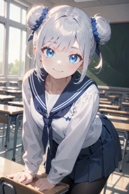 masterpiece, best quality, extremely detailed, anime , blue eyes, silver hair, Double buns, school uniform, sailor suit,hip, round face, smile, <lora:flat2:0.1> <lora:lightline:0.6> , wariza, classroom, pantyhose, hand between legs,