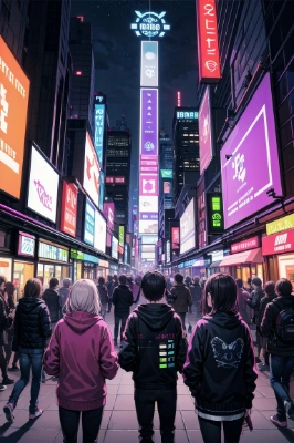 Neon city Color reversed city Game town City Hooded people Lots of population Purple hoodies Blondes Headphones Smartphones Jumbled town City without forests Lots of electronic billboards Billboards Commercials Ads,