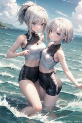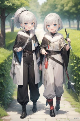 masterpiece, best quality, extremely detailed, anime, , SF, cartoon, a pretty woman, bobcut, ponytail, long sleeve, silver hair, blue eyes, ojou-sama, twin, two people, sisters, fantasy, cafe, smile, vacation, happy,Hide one eye with one\'s hair <lora:flat2:-0.05> <lora:hairdetailer:1> ,