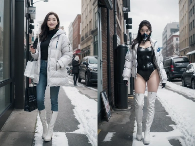 (photorealistic:1.4), (RAW photo), masterpiece, best quality, extremely detailed, lady, wife, gas mask, gloves, boots, shiny puffer jacket, leather mini skirt, tights, cold gaze, fearless smile, date, shopping street,
