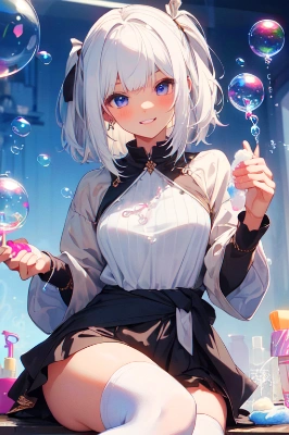 Masterpiece, high quality, super detailed, super high quality, very delicate and beautiful, female 18 years old, (((white hair two-side up to waist))), bangs to eyebrows, eyes sharp and strong glossy, eyebrows glossy, eye color magenta, 6.5 head height, knee socks, (((clothes bubble fashion))), smile, (((background big lots of soap bubbles))), blue sky<lora:flat2:-0.3> <lora:hairdetailer:0.8> ,