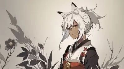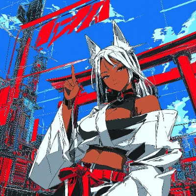 (masterpiece:1.2), (best quality:1.2), (novel illustration:1.1), (solo:1.2), brave female, (muscular female:0.4), (dark skinned:1.3) female, ((simple:1.1) Japanese miko:1.2), (fox ears:1.2), (white hair), small chest, ponytail hair BREAK extremely detailed, wind blow, cloud, tree flowers, <lora:Moxin_Shukezouma11:0.6>,