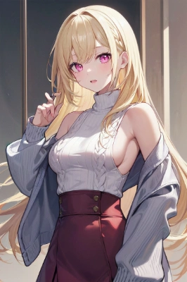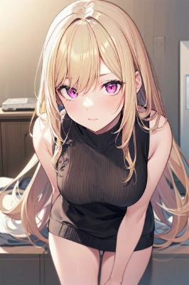 <lora:flat2:0> <lora:hairdetailer:0.5>, masterpiece, best quality, extremely detailed, beautiful detailed glow, ultra high res, beautiful, best aesthetic, 8k, anime, a pretty woman, longhair, blonde hair, pink eyes, ((medium breasts)),BREAK {sleeveless sweater|Oversized sweater|Oversized sweater},{standing|sitting|Leaning forward},side boob,