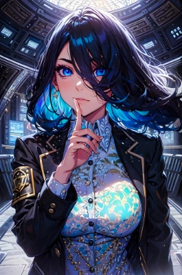 (absurdres absolutely resolution, insanely detailed, (iridescent), (pearlescent), vibrant colors, shiny skin, (insanely detailed eyes:1.3), (big highlight on eyes:1.3), dreamy, glitter, twinkles, light refraction, reflections, huge breast, boob tent, (solo), (1 girl), medium hair, intake, fluffy hair):1.2 BREAK (A captivating illustration features a futuristic cityscape as the backdrop, with neon lights casting a vibrant glow. The central focus is a tech-savvy girl donned in sleek cyberpunk attire, wielding holographic interfaces. Her dynamic pose exudes confidence, blending seamlessly with the sci-fi ambiance. space ship):1.2 BREAK (midriff shirt), (black jacket:1.2), Accessories featuring holographic materials for a high-tech aesthetic.