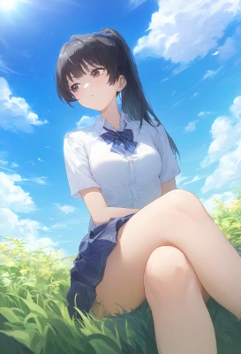 ,1girl,cool face,long eyelashes,looking away,black hair,long hair, ponytail,breasts,school uniform,white shirt,sitting, crossed legs, train interior,view from side,dutch angel,masterpiece,very aesthetic,extremely detailed,high resolution,perfect anatomy,, best quality, amazing quality, very aesthetic, absurdres
