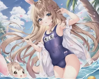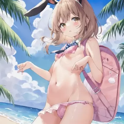masterpiece,kawaii,{kawaii},cute,{cute},nfsw,🐰,い,1 medium length light brown hair cute girl,{{{nude}}},{{wear school swimsuit}},{equip firm-sided backpack made of stitched firm leather or leather synthetic material},summer beach background with shining,,[equip pink backpack],midium breasts,