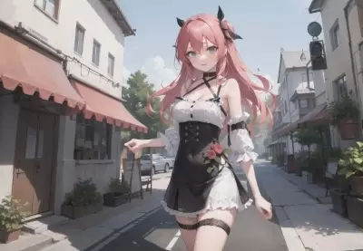 ((masterpiece:1.2)), ((best quality)), (ultra-detailed:1.2), ((extremely detailed:1.2)), 4K, (8K:1.2), best quality, (beautiful),1girl, bangs,blue_eyes, blush, dayhair_between_eyes, hair_ornament, hair_ribbon, long_hair, parted_lips, sea, beautiful sky, solo,walking,White suit, black tie, white leather shoes, watch, earringsCity, sidewalk, roadway, cars, buildings, big city, nature,Bridges, rivers, radio towers(Looking down from above:1.5)