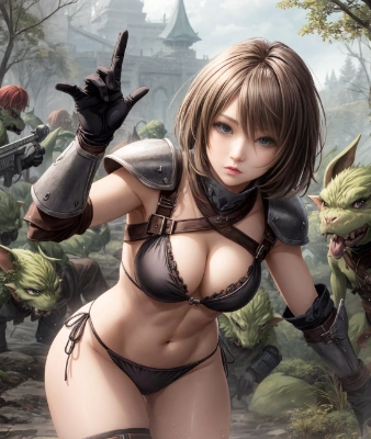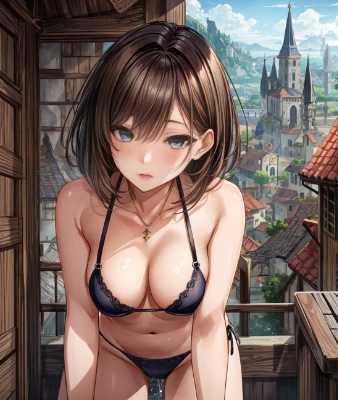 (sex establishment in a fantasy world:1.5),(downtown:1.3),(brothel:1.5),(Unsafe medieval town:1.5),cinematic light, colorful, hyper detail, dramatic light,high resolution,best quality, masterpiece, best quality, ultra-detailed, illustration,1female, solo,Beautiful Eastern European female,extremely delicate and beautiful girls,intrepid face,(small eyes:1.2),25 years old,hdr,BREAK,(realistic:1.0),grey eyes,large breast,brown hair,short hair,bikini, BREAK, fight,action pose,dynamic angle, <lora:add_detail:1>,(Many Adventurers:1.5)