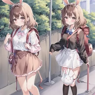 {{{Raise the waist cord to emphasize the waist}}},masterpiece,kawaii,{kawaii},cute,{cute},🐰,い,1 medium length light brown hair cute girl,wear school idle fulil skete,midium breasts,equip firm backpack made of stitched firm leather material,equip pink backpack,town background
