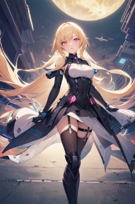 , masterpiece, best quality, extremely detailed, beautiful detailed glow, ultra high res, beautiful, best aesthetic, 8k, anime, a pretty woman, longhair, blonde hair, pink eyes, ((medium breasts)), smile, ((SF, science fiction)), panty shot <lora:flat2:0> <lora:hairdetailer:0.5> <lora:hohoaka:0.4> ,