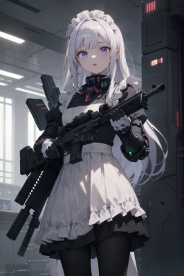 masterpiece, best quality, extremely detailed, anime, girl, skirt, SF, a pretty woman, longhair, maid uniform, white hair, purple eyes, mecha girl, horror, fantasy, machine, science fiction, gun, mecha, different world, shooting, cool <lora:darkness_v100:0.3> ,