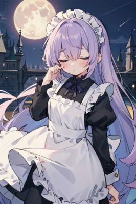 masterpiece,best quality, extremely detailed, secret devil-girl bat-wings ((mekakure,)) ((covered eyes, hair over eyes, )) ((bangs, long bangs, ))red-eyes long-purple-hair maid clothes. high-fantasy-style .devil-king-castle night full-moon speech-heart public-tatoo smiling solo blush kiss-face,
