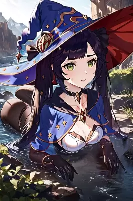 best quality,ultra-detailed, extremely detailed CG,beautiful , , (genshin),(mona:1.2),(genshin impact1.5),black hair,green eyes, long hair,light twin tails,black tights,small breasts,short girl,blue clothes, blue arm support ,witch hat,straight bangs,photorealistic, by famous artist, world masterpiece, full_body, view straight on,wet, flat chest, girl,woman,female, young,20 yearsold,sidelocks, Authentic and detailed face, small_breasts, bright skin, Gemological ornaments,choker, capelet, black_gloves, high_heels, collarbones,outdoors, landscape, an epic scene, Absurd,dynamic background,detailed background