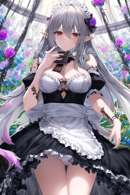 masterpiece, best quality, Sheer Dirndl Elegance" Costume: A modern dirndl-inspired outfit with delicate, see-through pale pink fabric that highlights the shoulders and offers a cute twist. The two-tiered frill straps adorned with a dainty ribbon and a slender waist belt give a chic flair. Background: Against a serene blue sky with drifting white clouds, creating a whimsical atmosphere. Character: A solitary elf with silver long hair and captivating red eyes. A black rose accessory adorns her bare shoulder. Frill sleeves on her upper body add allure. Story: Amidst dancing black rose petals, she stands enigmatic and fascinating, her presence mysterious against the delicate petals. Addition: Her allure is further enhanced by a rose petal see-through dress. Accents shaped like rose petals on the upper body and skirt, her up-styled wavy hair adds to her charm.., with blush cheeks, official art, {{ultra-detailed}}, {{high resolution}}, dynamic fuzziness, colorful, cowboy shot, underwear, girl ,solo, 20 years old, beautiful detailed hair, beautiful detailed eyes, kramskoi, realism,