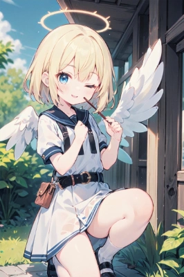 Angel wing,halo,blond long hair,two side up,blue eyes,in Parthenon,sky,wearing white dress, smiling,holding a pocky,one knee<lora:lightline:0.65> <lora:kasshokuhada:-1> ,