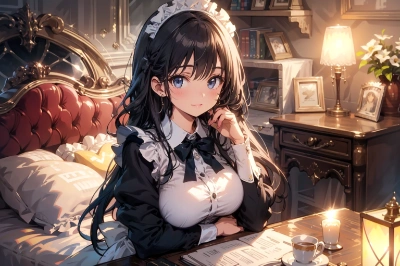 sharp focus, 2girl, kawaii,maid, soft smile, long hair, black hair, shiny hair, black eyes, middle large breasts, classical maid clothes, night bedroom, old furniture, night service, sleep together in bed, lamp light,