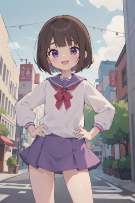masterpiece, best quality, extremely detailed, anime, girl,<lora:flat2:0.55> <lora:hairdetailer:0> , bobcut, brown hair, purple eyes, (loli face:1.2),((medium breasts)),(school swimsuit), pause, classroom,