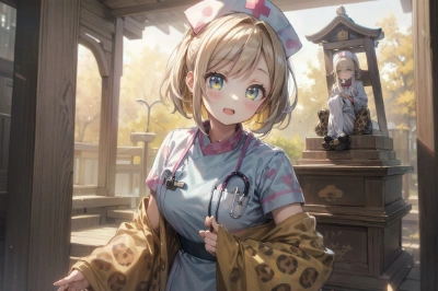 masterpiece, best quality, mammy_girl. lying glitter-eyes. in(leopard_pattern print cute yellow nurse). cuteaccessory . Ema.in shrine . .in ultimate quality absolutely detail maximum cute