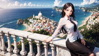 Masterpiece, best quality, highres, ultra detailed character, anime coloring, calm adult woman, solo, forehead, brown hair, sapphire eyes, curvy, large breasts, Down jacket, skirt, pantyhose, thigh boots, gloves, smile, breath, steaming, looking at viewer, standing, peace sign, snowy , in front of restaurant, seat, people, window, (skis:1.1), snowman, light, outdoors, cold, night, dark , close-up