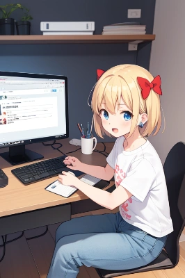 1girl, solo, short blonde hair, blue eyes, red ribbon in hair,(hair bow:1.2),red bow, discovering an ancient rusty sword, grassy field, reaching for the sword, youthful appearance, petite figure, small chest, playful expression, casual clothing, gentle breeze, clear sky, midday sun, vibrant green grass, wildflowers, sense of adventure, detailed sword design, rust texture on the sword, sunlight glinting off the blade, sense of wonder, curiosity in her eyes