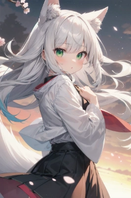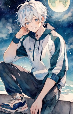 masterpiece, best quality, extremely detailed, anime, girl, skirt, a cool boy, good-looking guy, handsome man, long sleeve, white hair, black eyes, fox girl, watercolor, star gazing, snow, starry sky, smiling,Center separation,