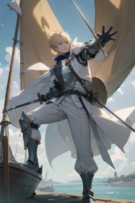 masterpiece, best quality, extremely detailed, anime, full body shot, a cool man, adult man, good-looking guy, handsome man, shorthair, bright blonde hair, green eyes, clear face, crusader, knight, plate armor, white clothes, medieval white pants, white surcoat, white long cloak, (holding a sword), fighting pose with the sword, blue sky, sea, on the ship deck, medieval sailing ship, middle ages, age of discovery,