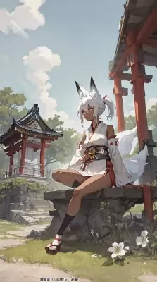 (masterpiece:1.2), (best quality:1.2), (novel illustration:1.1), (solo:1.2), brave female, (muscular female:0.4), (dark skinned:1.3) female, ((simple:1) Japanese miko:1.2), (fox ears:1.2), (white hair), small chest, ponytail hair BREAK extremely detailed, ruined temple, destroyed shrine, cloud, tree flowers, <lora:Moxin_Shukezouma11:0.5:CBC>,