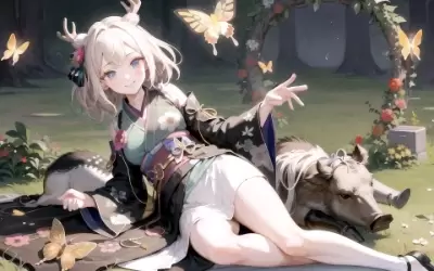 草木の上に座っている蝶々の人の絵です