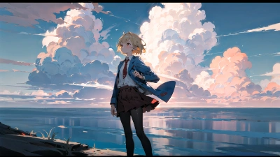 (best quality, masterpiece, ultra-detailed, illustration),(8K wallpaper), (1girl,solo), blonde hair, ponytail, red eyes, black school uniform, young adult, bicycle, rice paddy, rice field, sunny, summer, sky, (cumulonimbus), mountain, (beautiful landscape), depth of field, blurry background