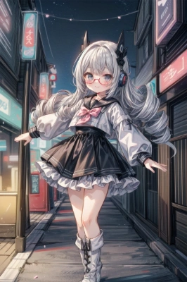masterpiece, best quality, extremely detailed, anime <lora:flat2:-1> <lora:hairdetailer:1> , kawaii, teenage girl, white hair, drill hair, original character, colorful, pastel color, cyberpunk, smile, full body, standing, sailor suit, pink thick frame glasses, , Lolita fashion, thigh high socks, cute loafer shoes, angelic pretty, fantasy, DJ , headphone, keyboards,many displays,