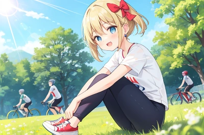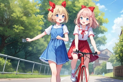 2girls, (hair bow:1.2),red bow, short blonde hair, blue eyes, red ribbon in hair, watching a cycling road race, looking amazed at the speed, standing, blue dress with white dots, bare legs, pink sneakers, hands on cheeks, open mouth smile, trees and crowds in background, looking towards the right,<lora:flat2:-0.5>