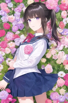masterpiece, best quality, Hairstyle: The girl's hairstyle is long hair with brown hair color. The hair has a slightly curly wave. The bangs are a long side part that covers the face, giving it a fluffy feel. and you can feel the gentleness of a girl. What she is holding: The girl has some small flowers in a small basket in her hand. The basket is decorated with a pink ribbon. The girl is looking carefully at the flowers in the basket. Scenery around: Many colorful flowers are blooming around the girl. It stands in a field of flowers with a blue sky in the background., with blush cheeks, official art, {{ultra-detailed}}, {{high resolution}}, dynamic fuzziness, colorful, cowboy shot, underwear, girl ,solo, 20 years old, NSFW, medium breast, pussy, embarrassed, love juice, sex, cum, lying on canopy bed,